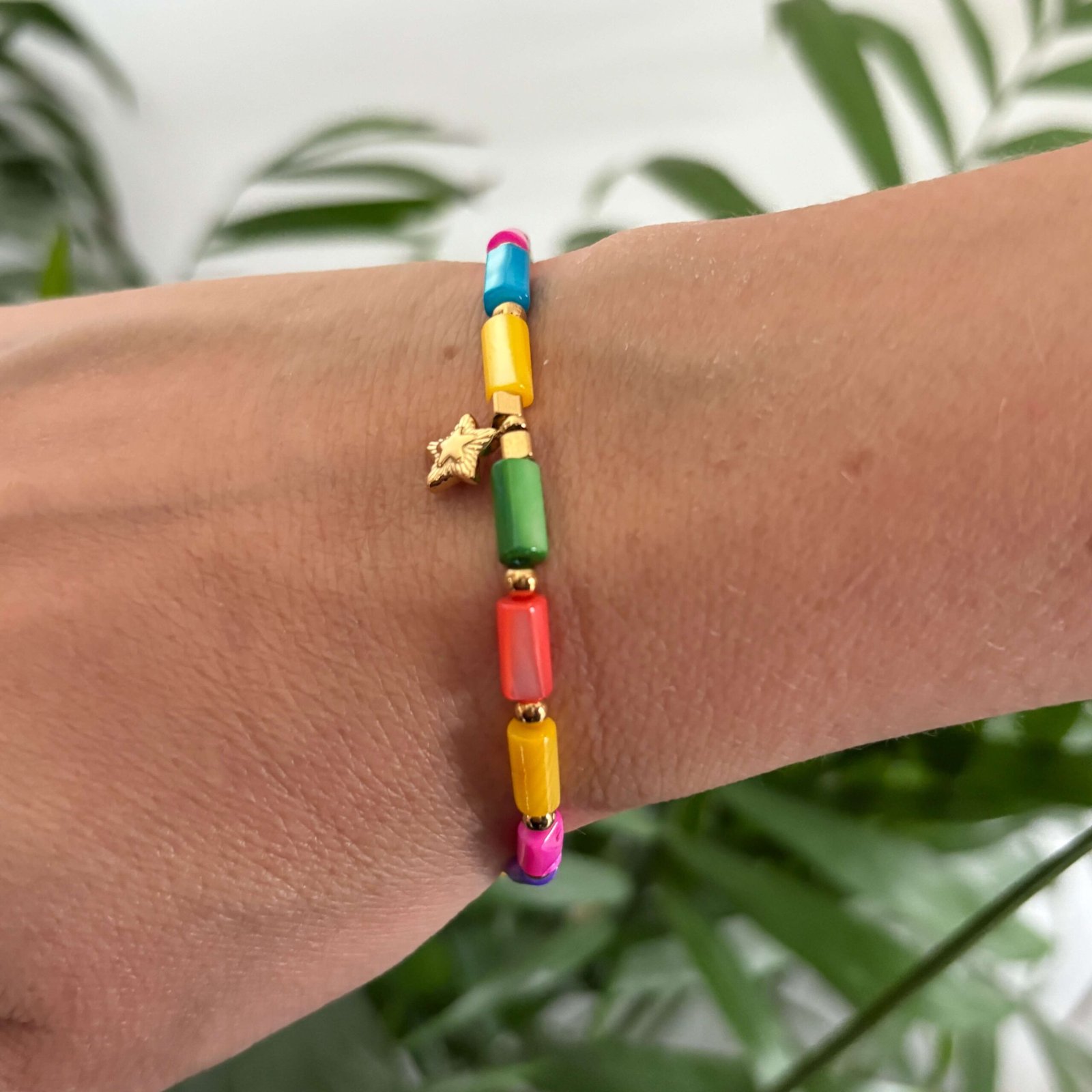 Vrolijke armband met kleurrijke schelpkralen, afgewisseld met goudkleurige accenten.