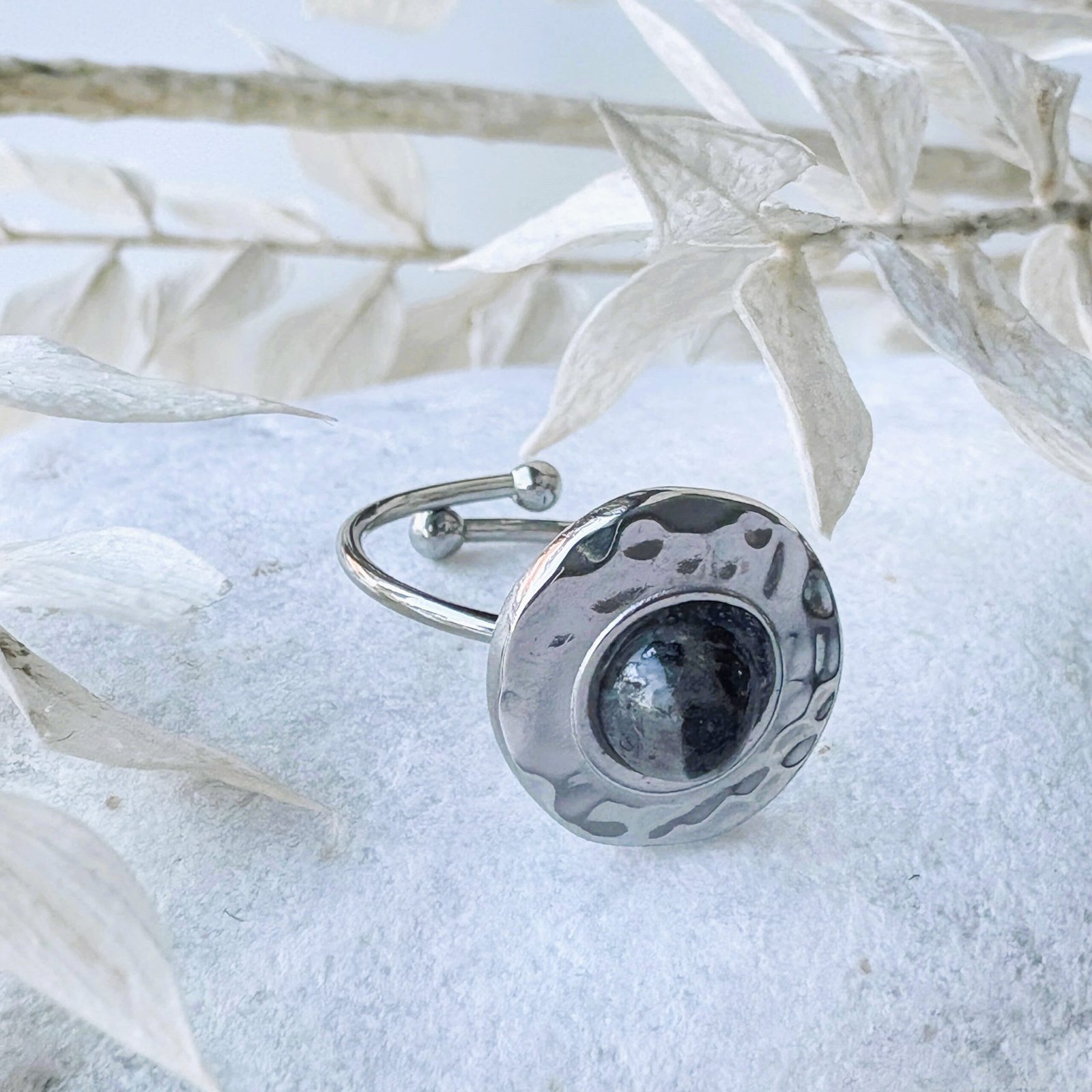 Zilverkleurige ring van roestvrij staal met een ronde natuursteen.