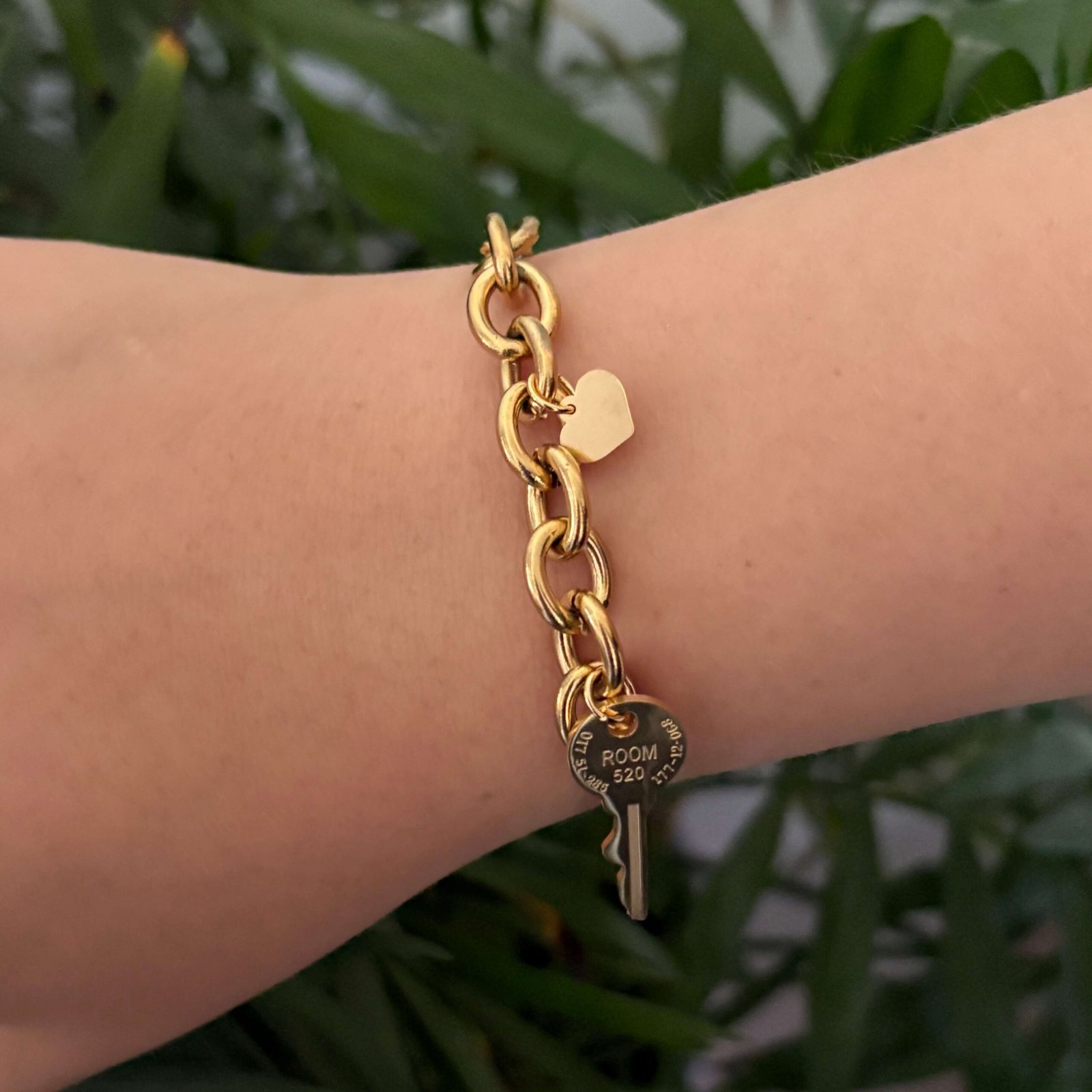 Stijlvolle chunky schakelarmband van roestvrij staal met speelse bedels: een hart en een sleutel met gegraveerde details.