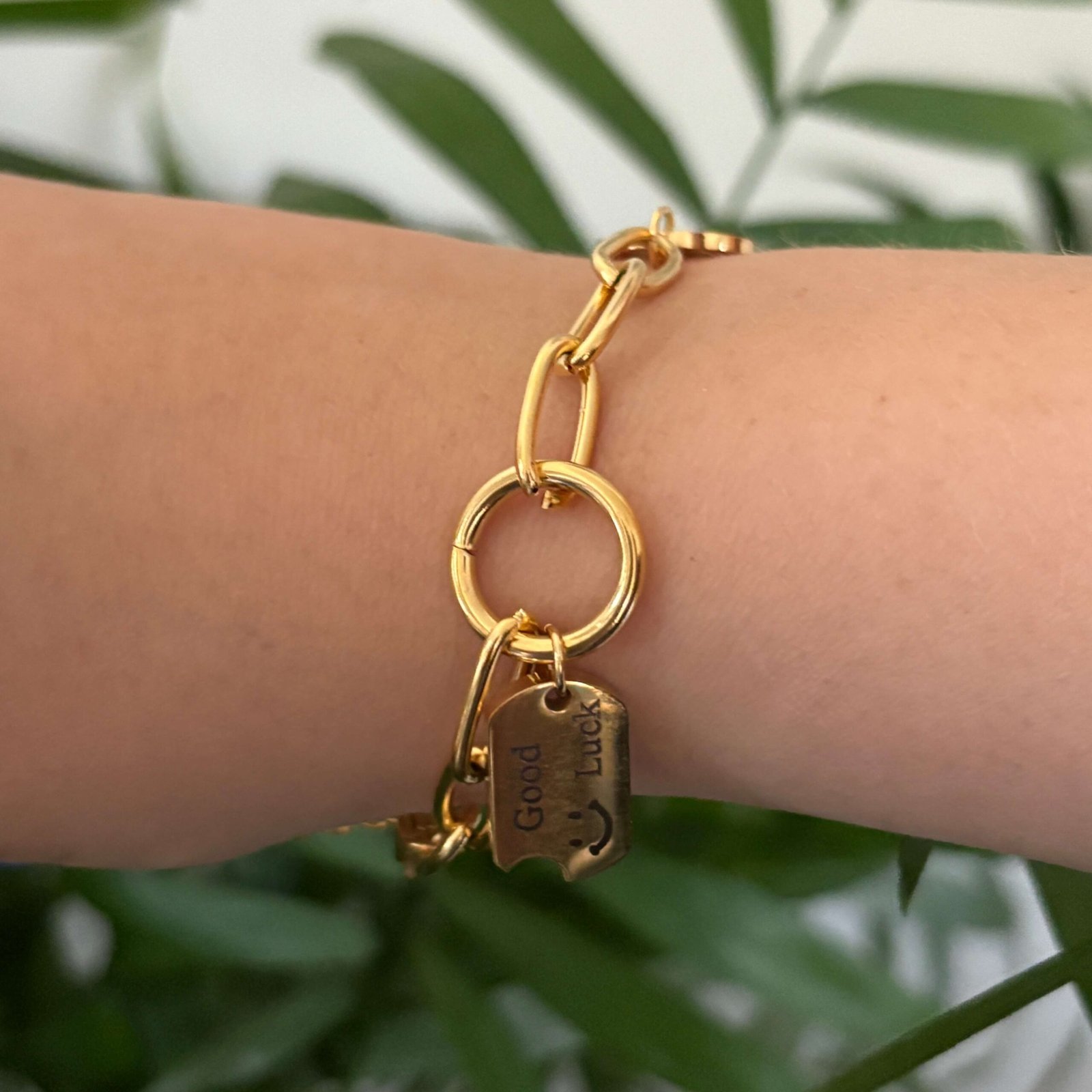 Trendy goudkleurige schakelarmband van roestvrij staal met vrolijke smiley-bedels en een speelse ‘Good Luck’-tag.